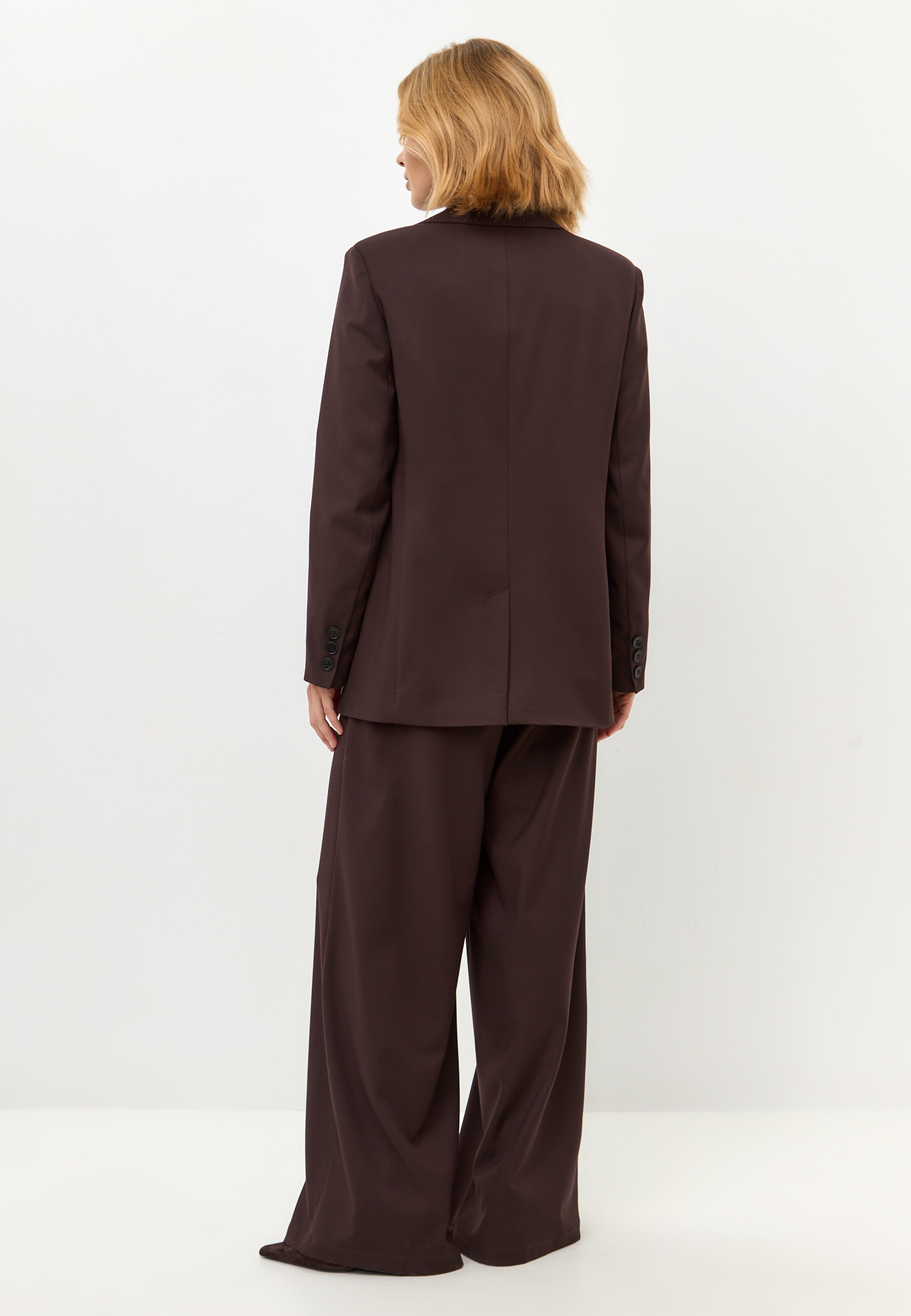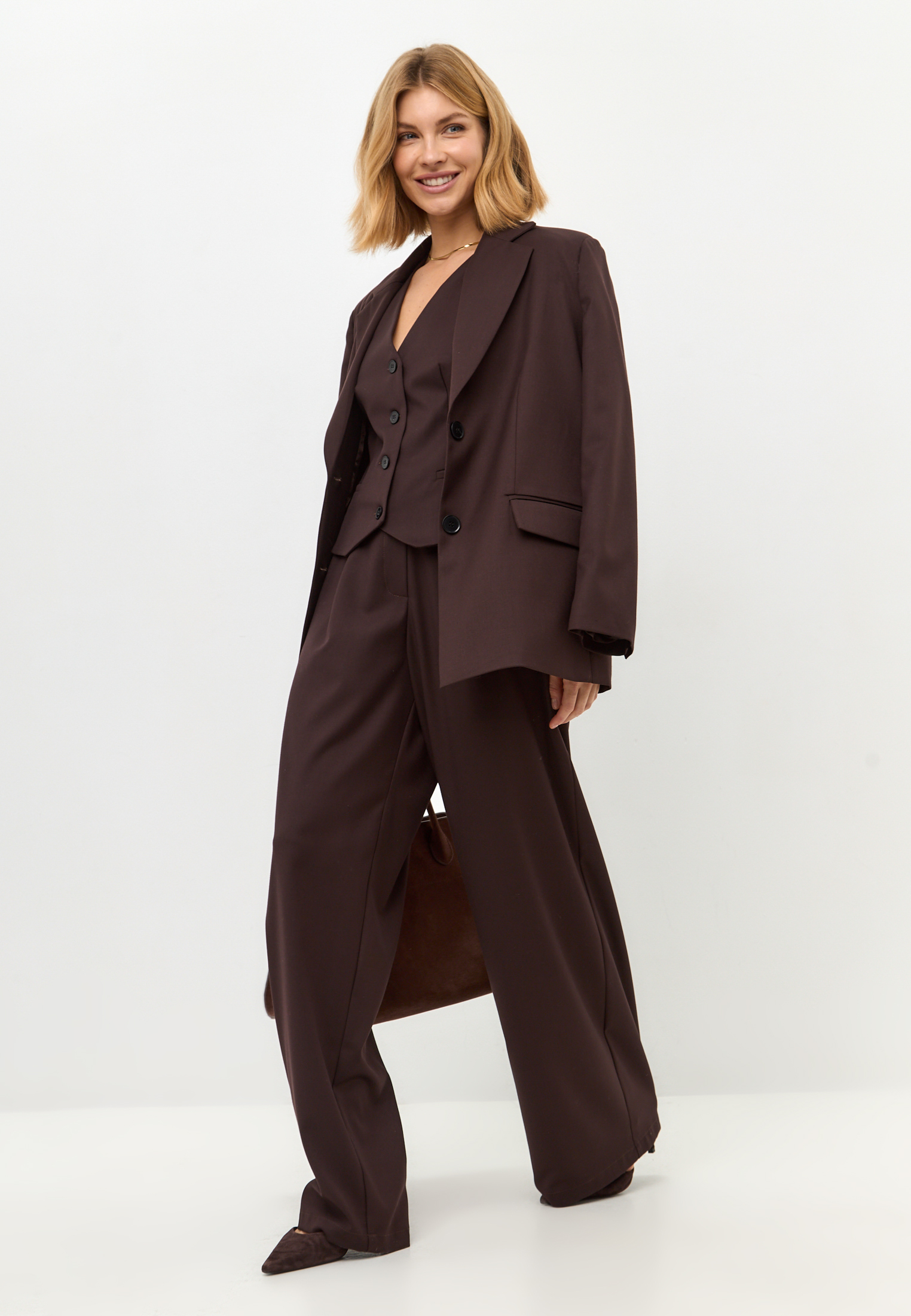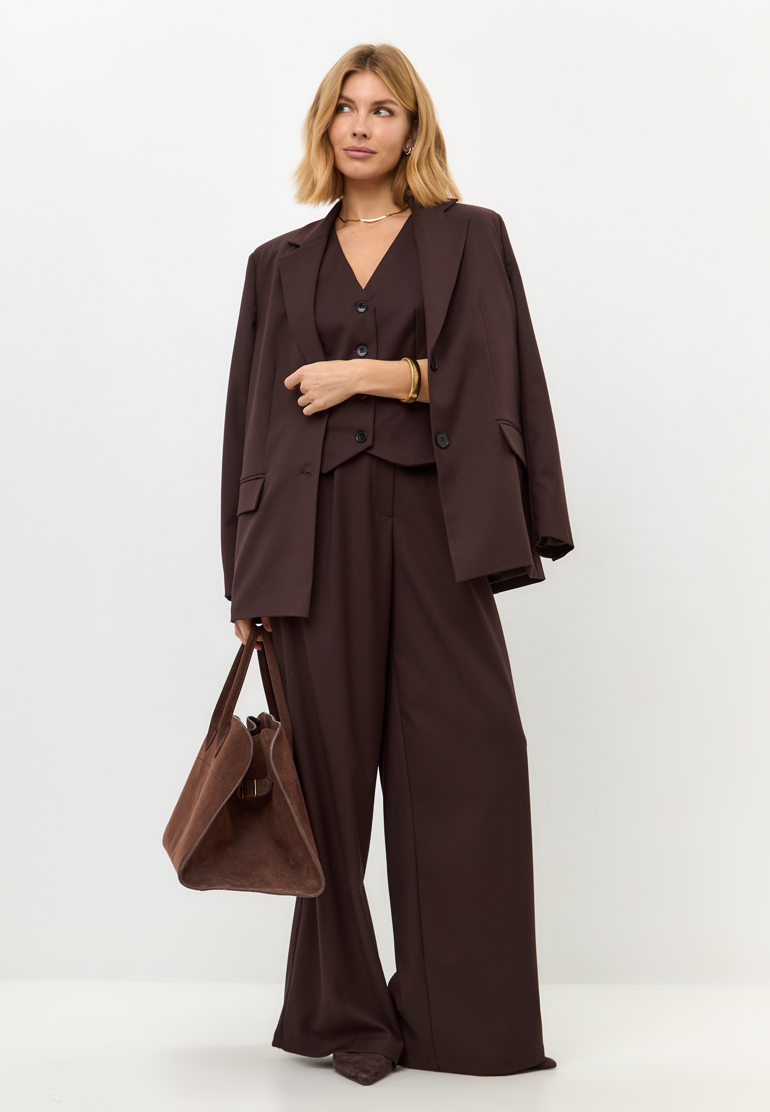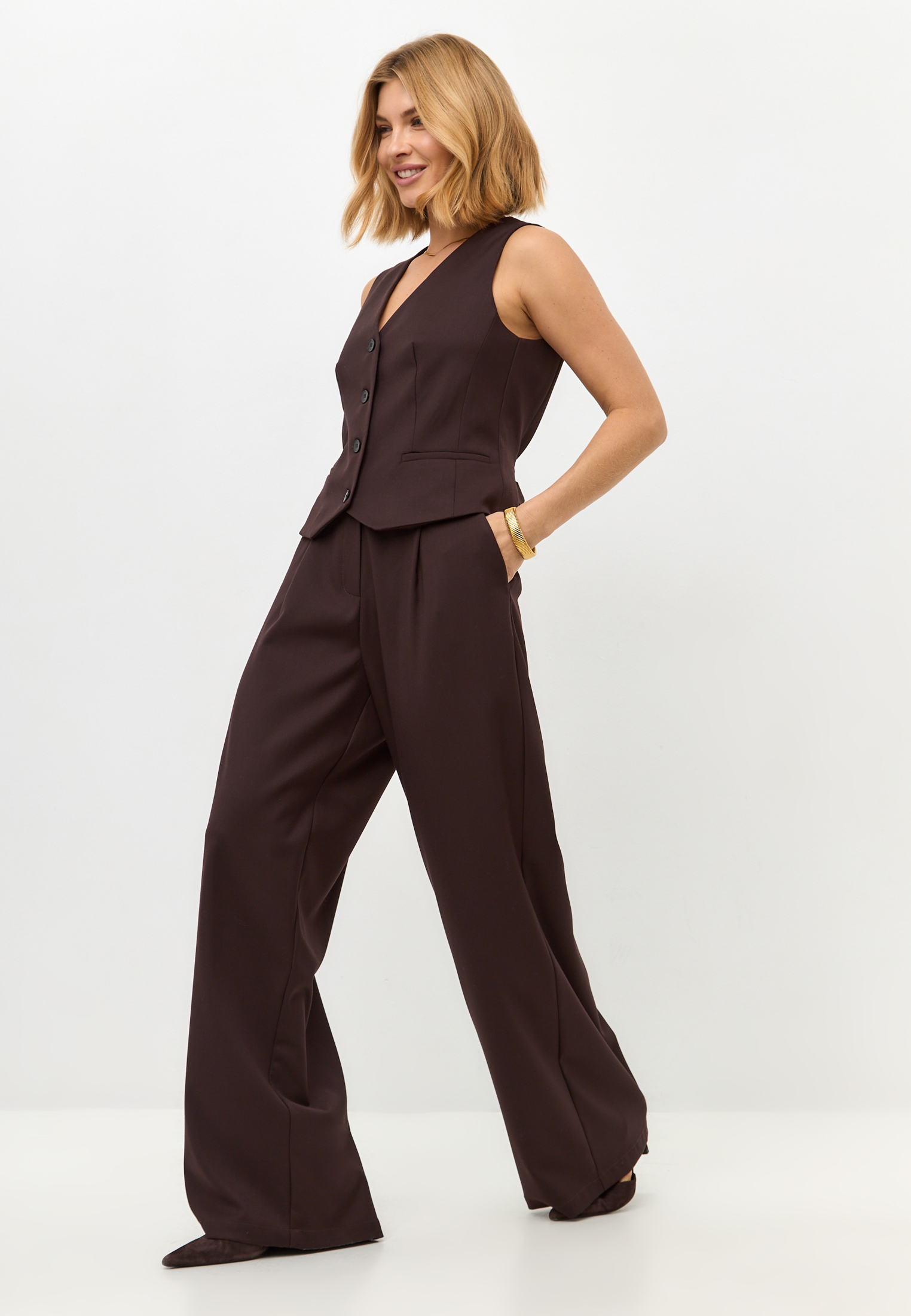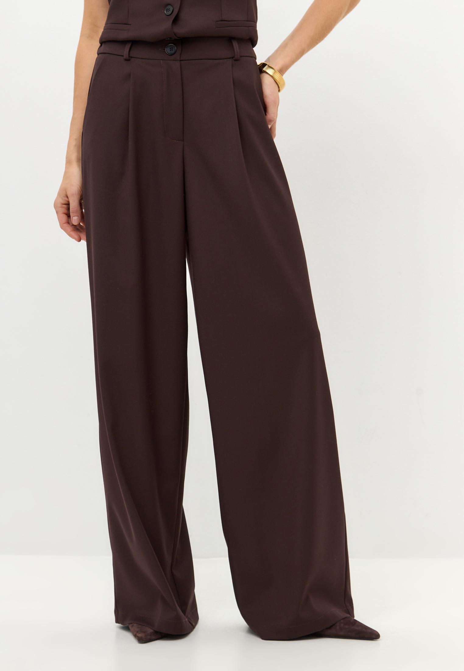 Брюки широкие прямого кроя, с защипами из под пояса, шлевками и