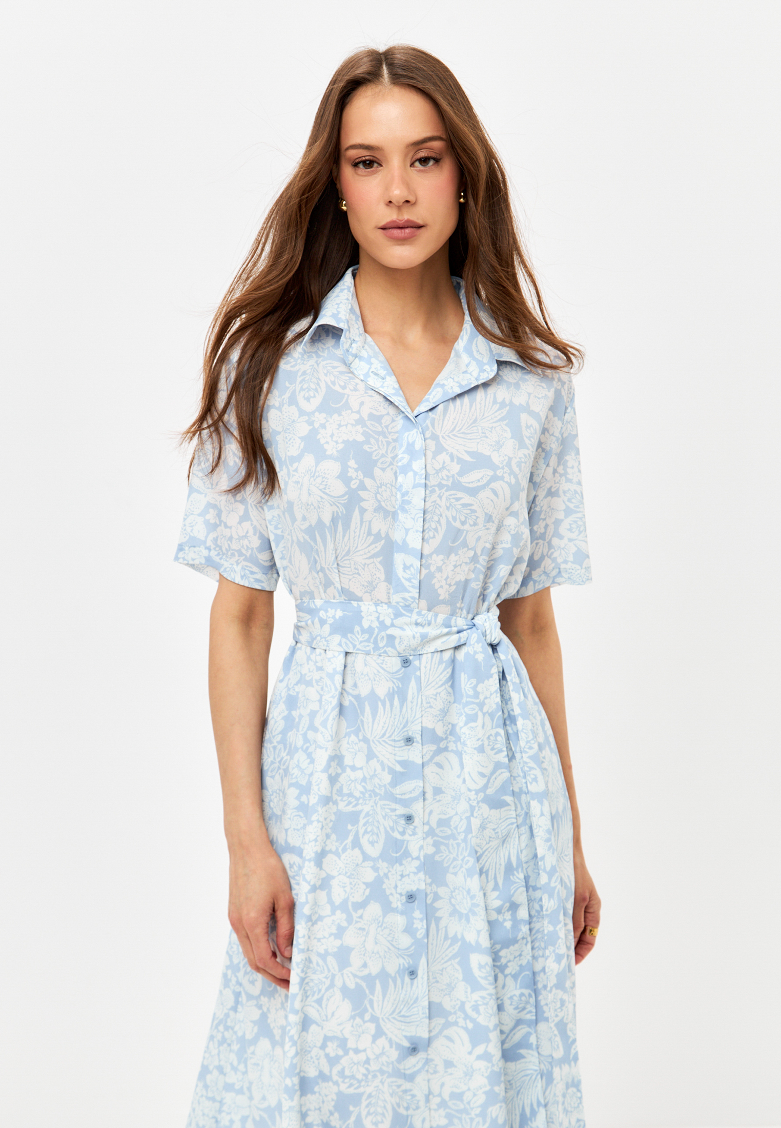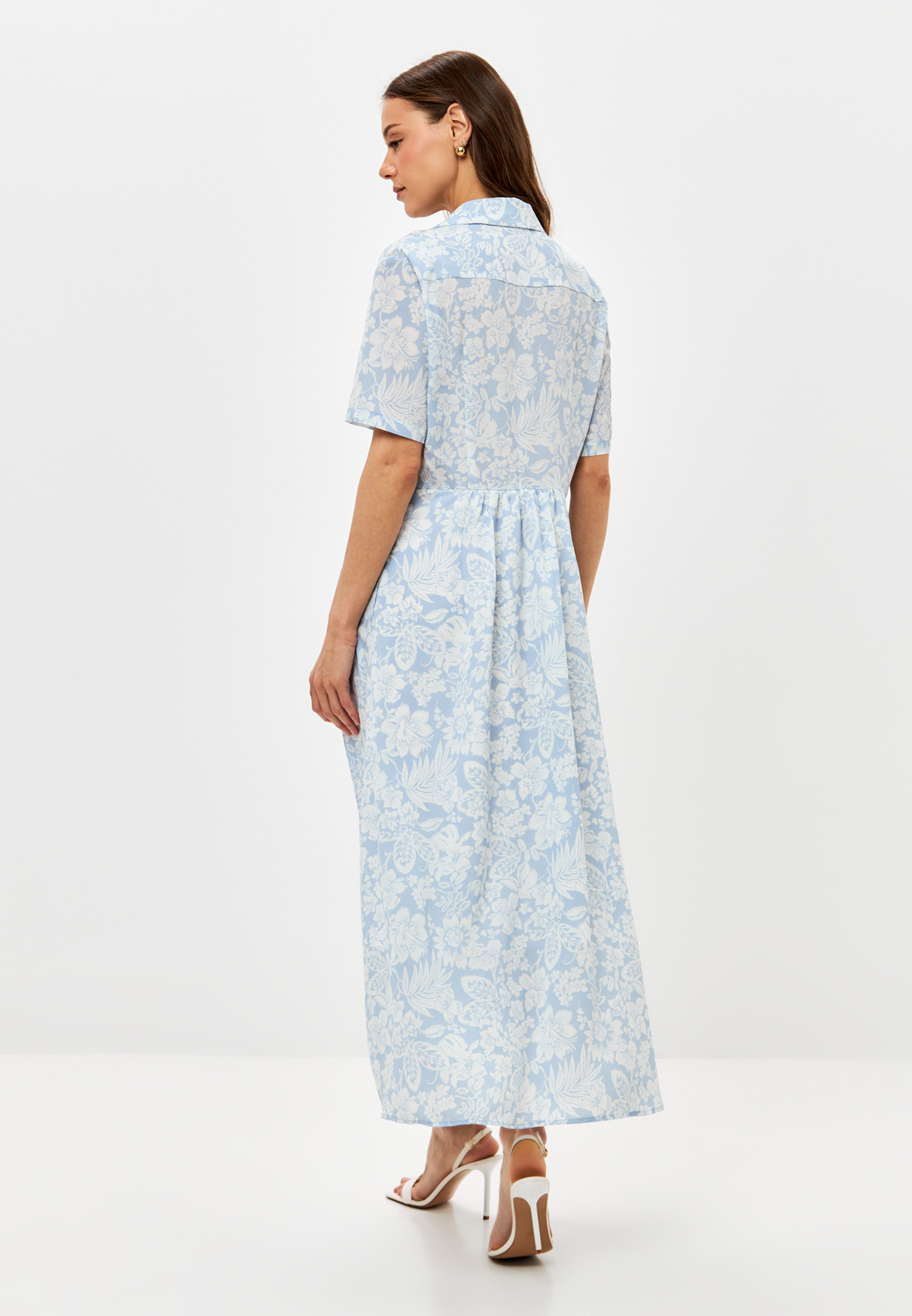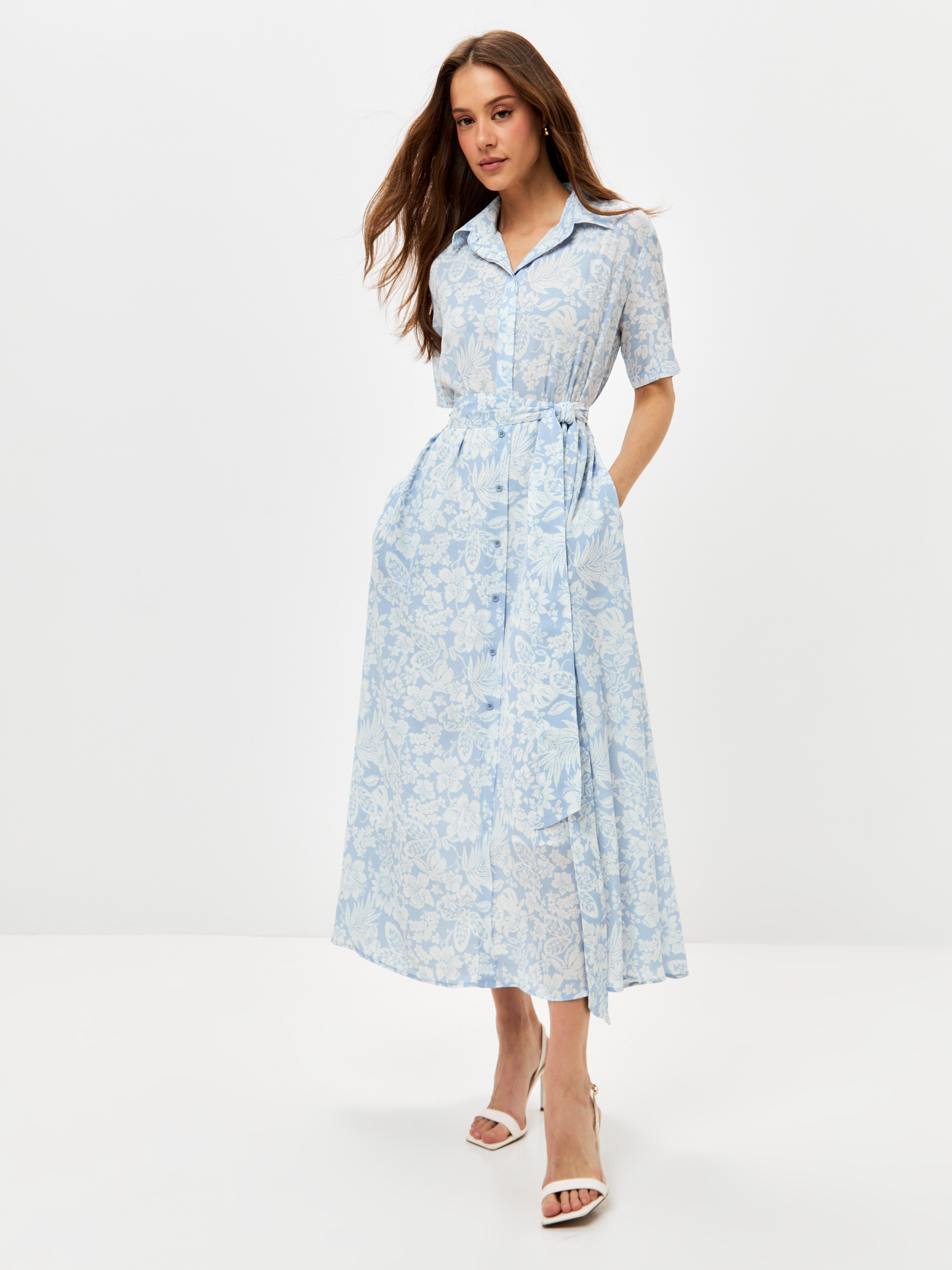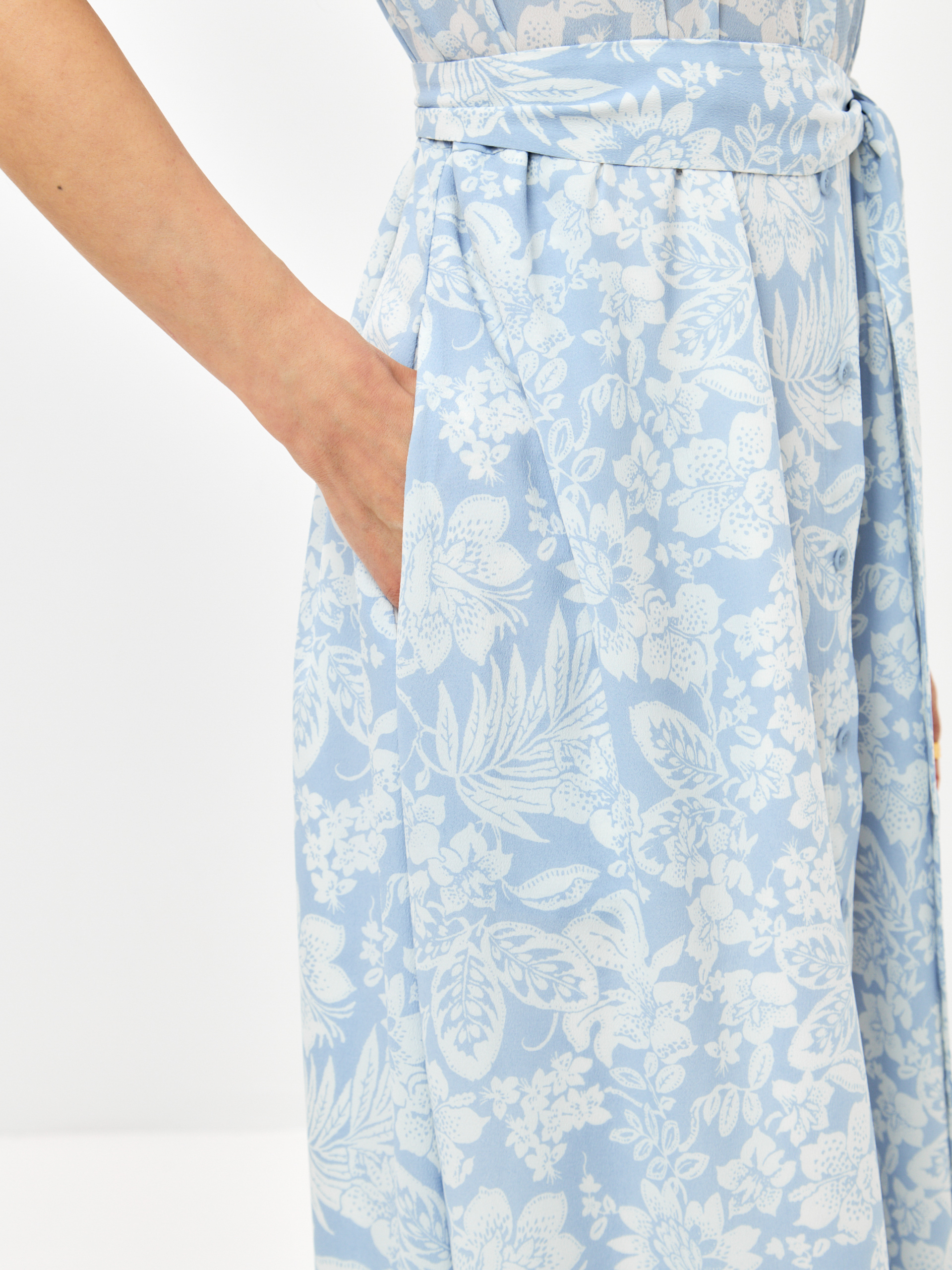 Платье - рубашка полуприталенного силуэта, на подкладке от талии. Расстегивается до пояса. В боковых швах карманы. На спинке кокетка.