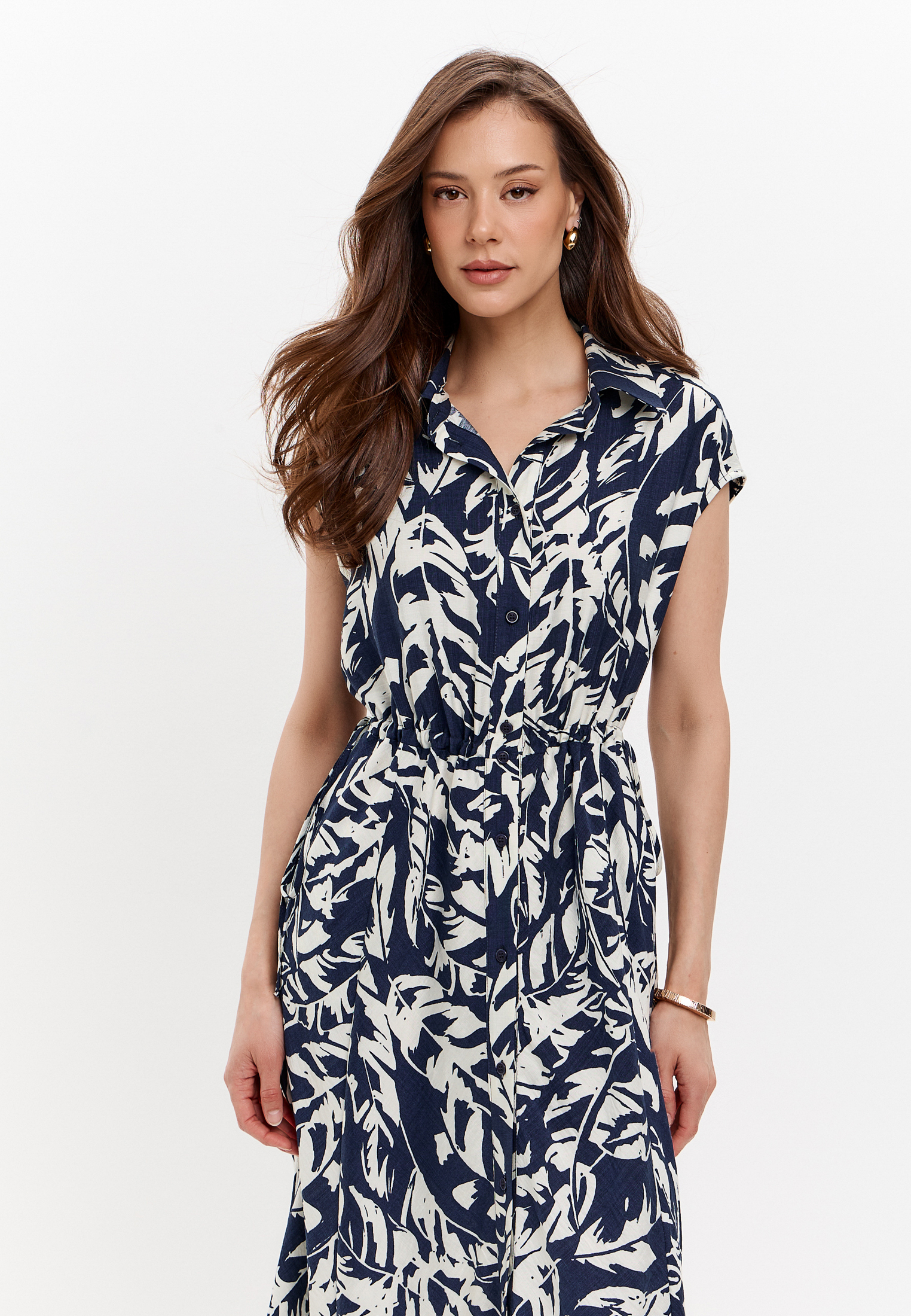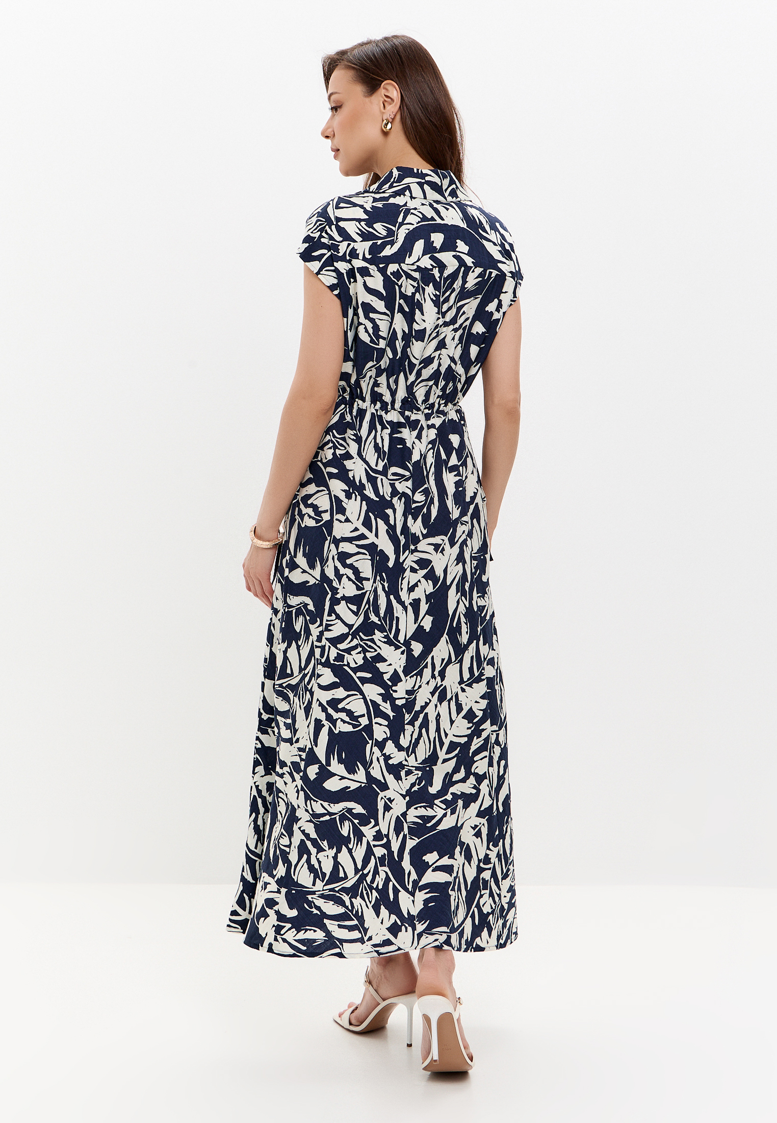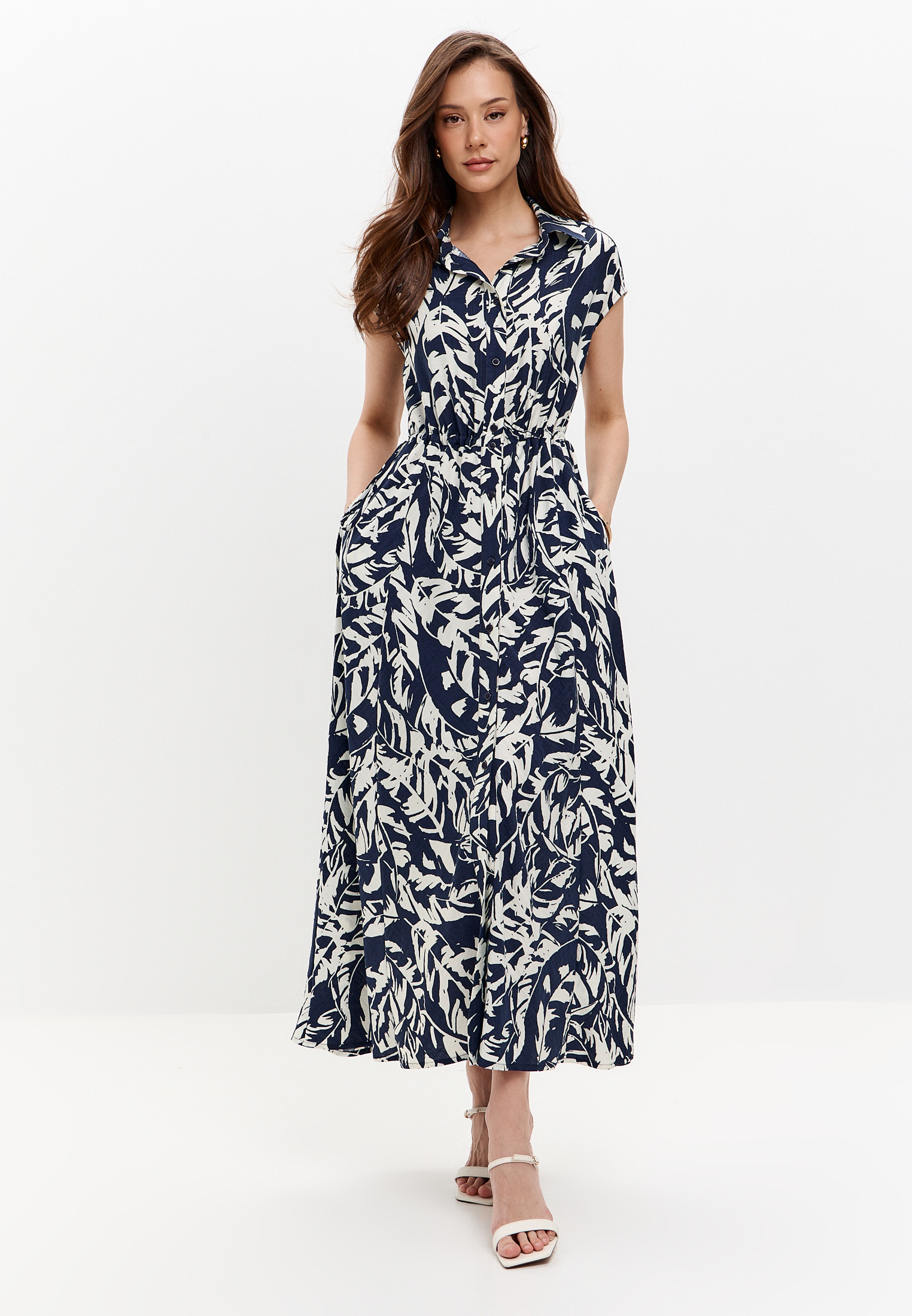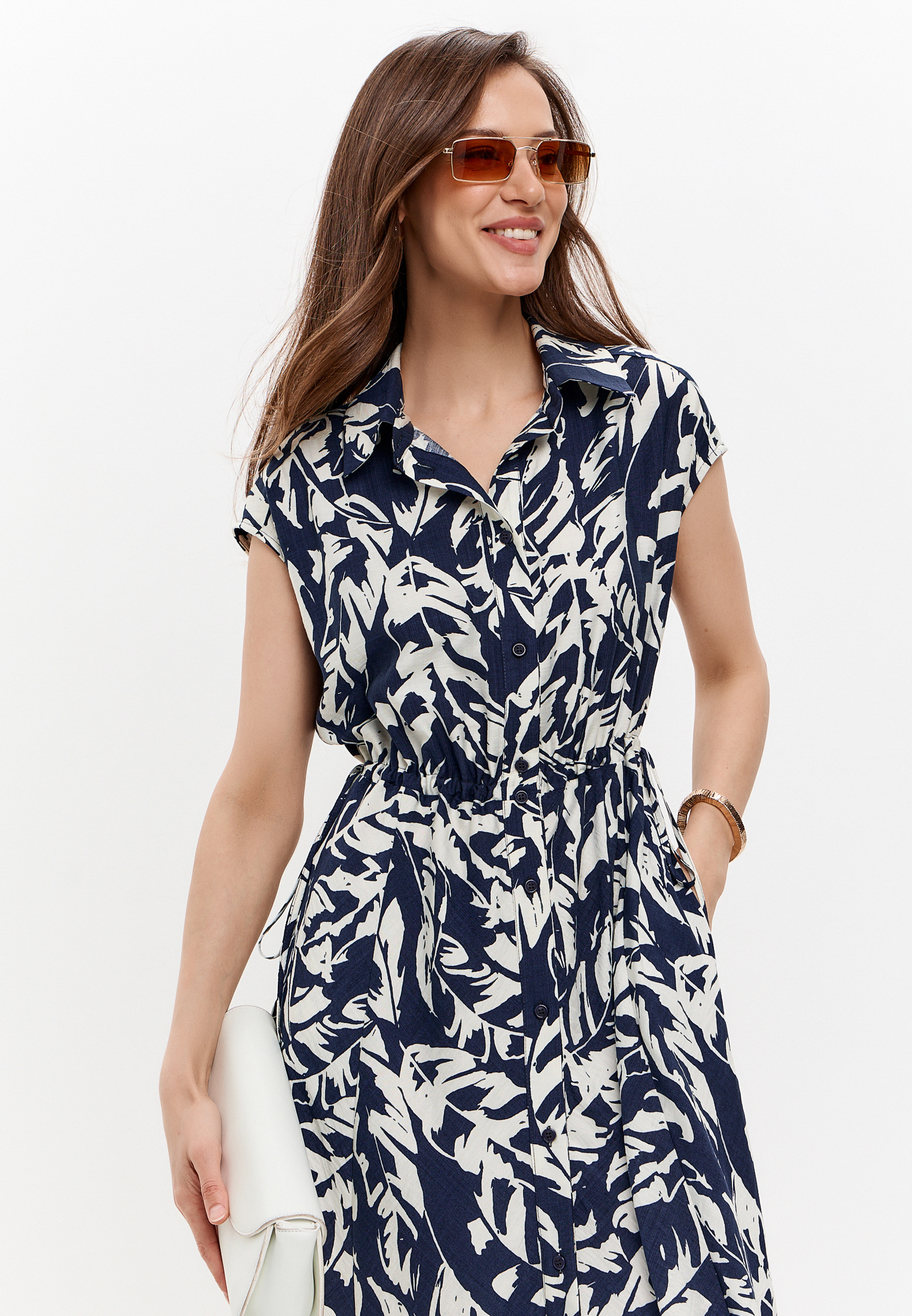 Платье рубашка макси сложного кроя с поясом на кулиске, спущенной линией плеча, карманами в боковом шве.