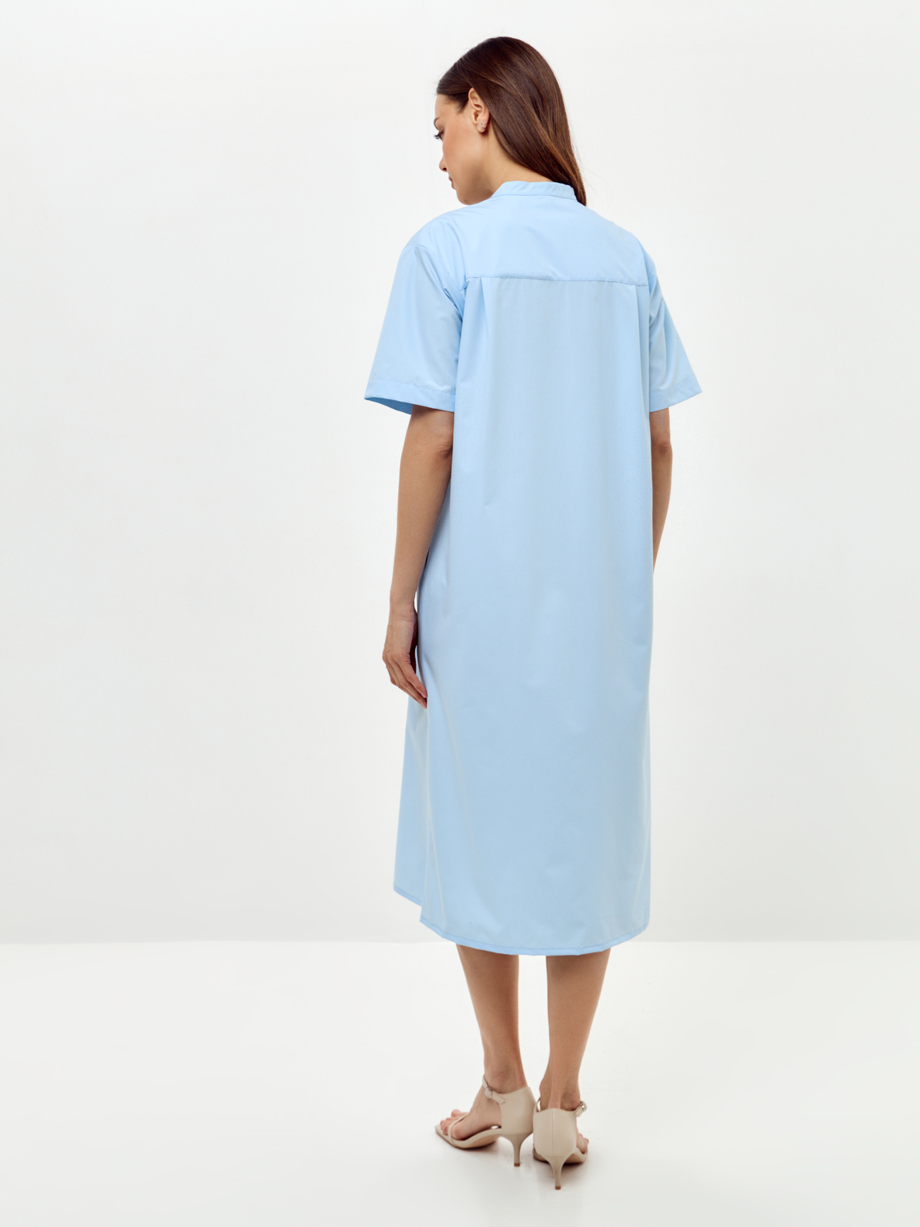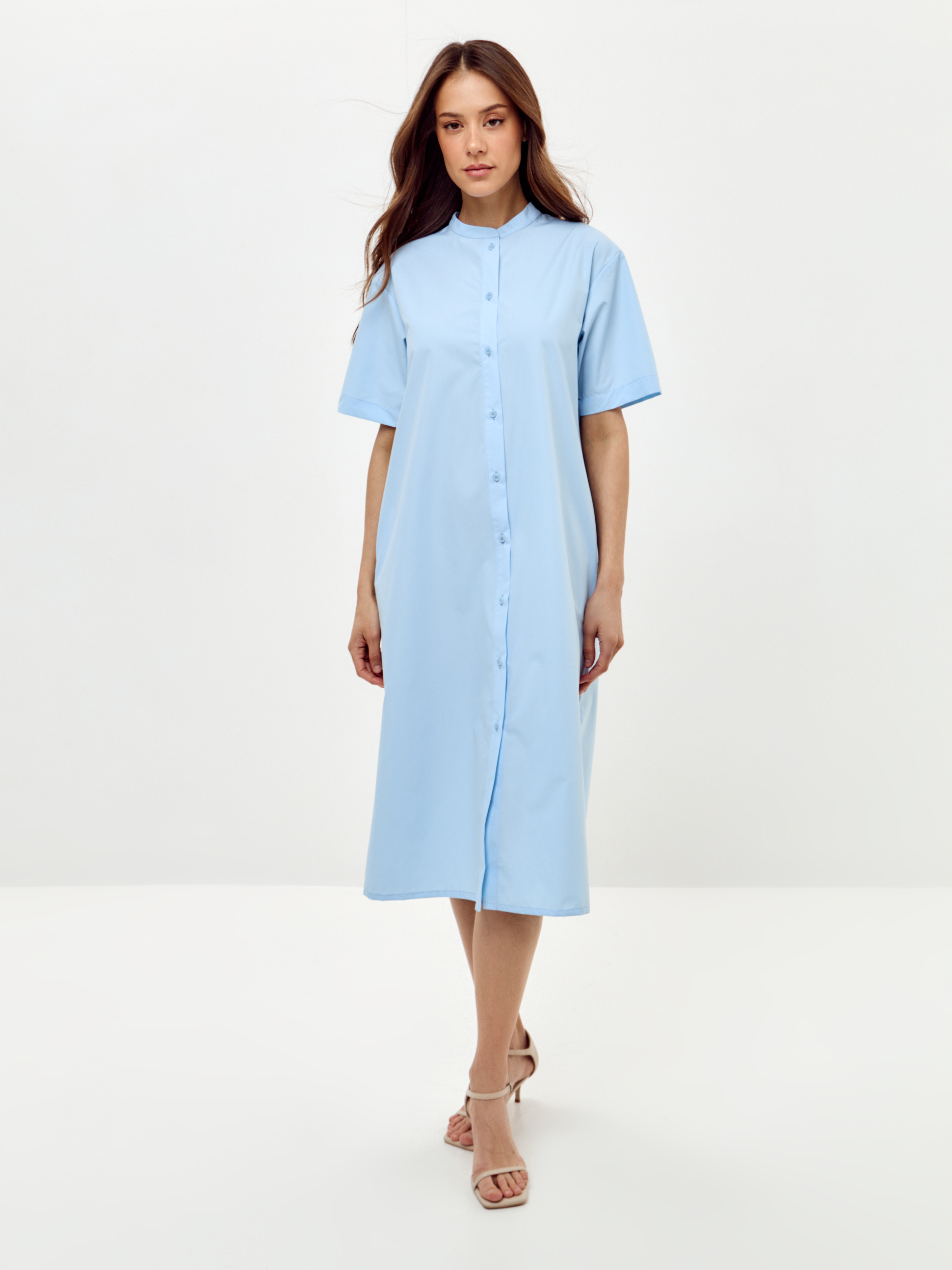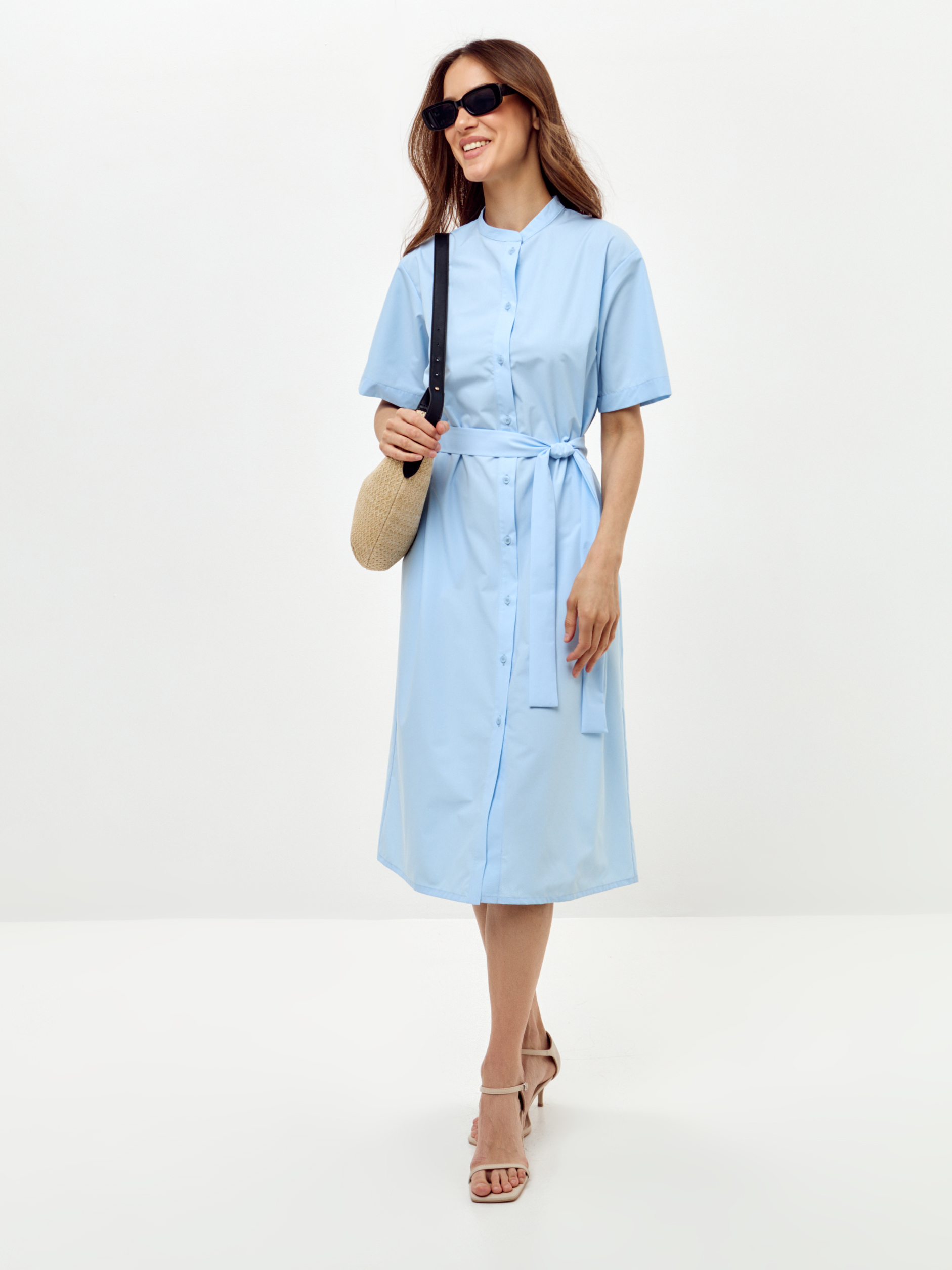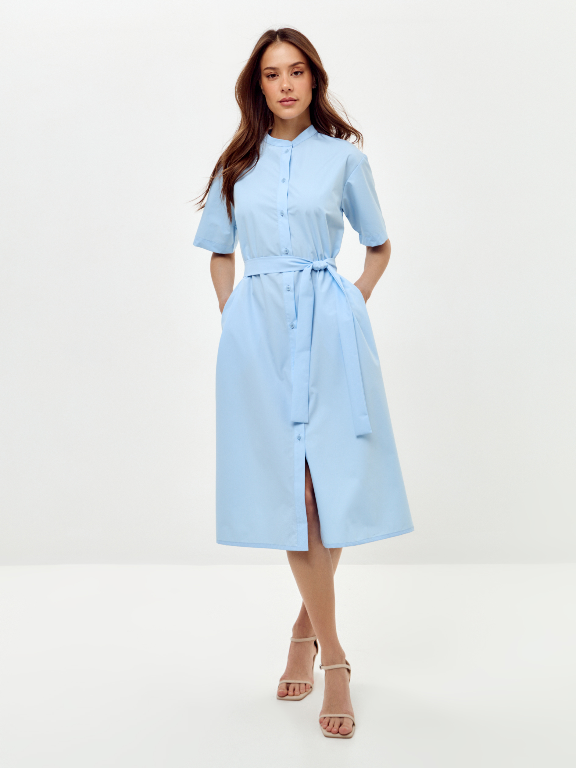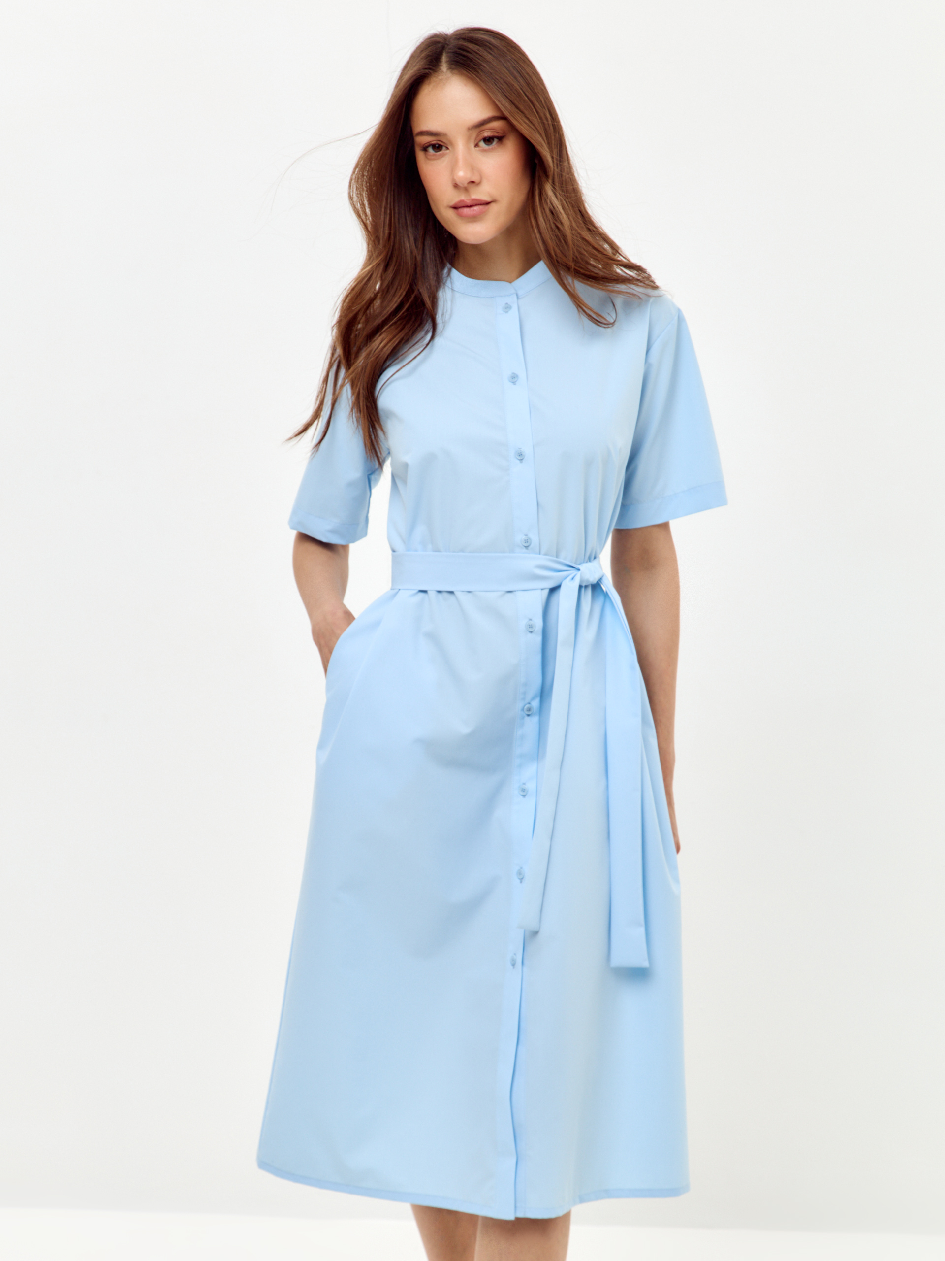 Платье-рубашка, прямого силуэта с без воротника на пуговицах и поясом по талии.