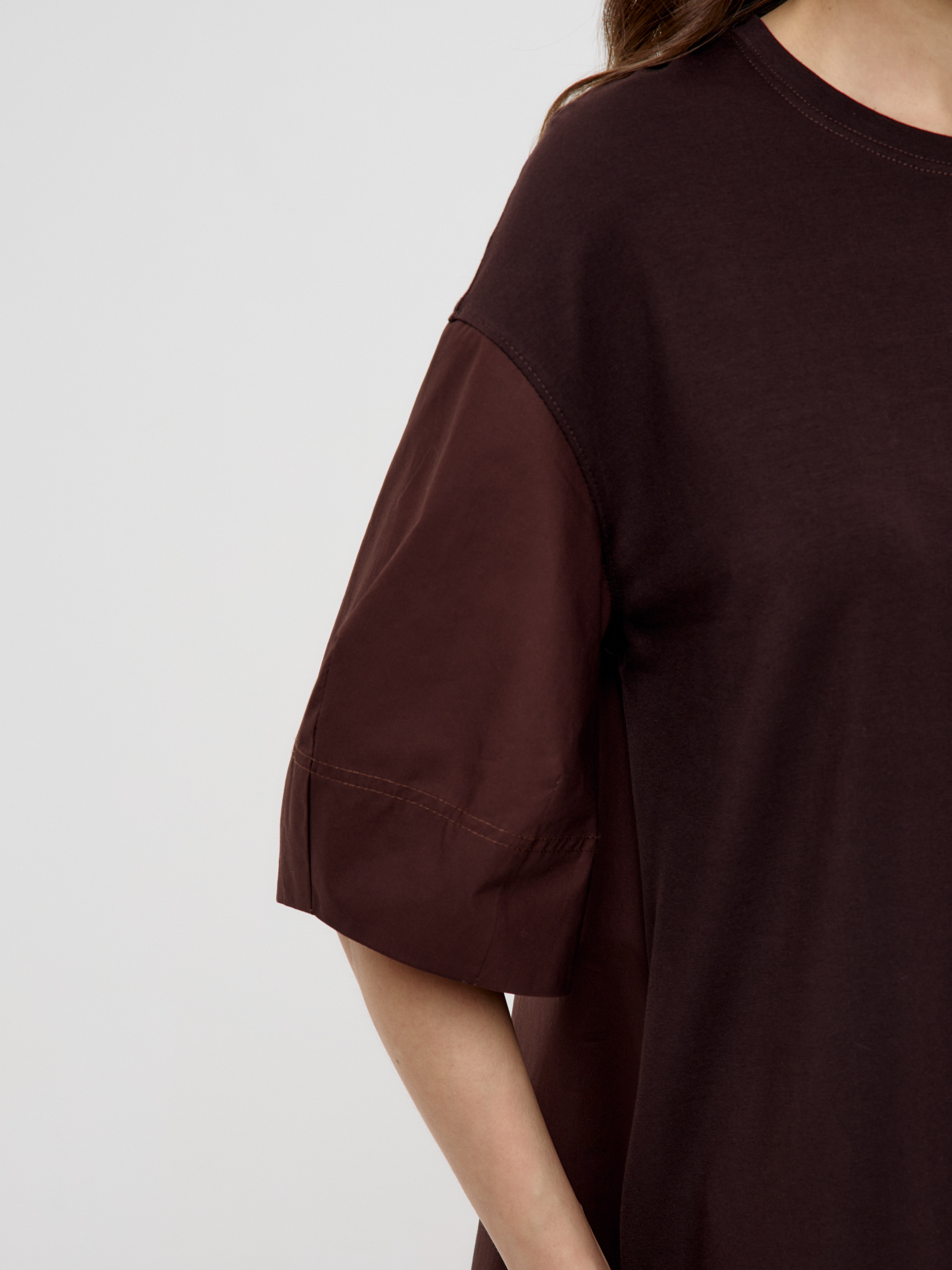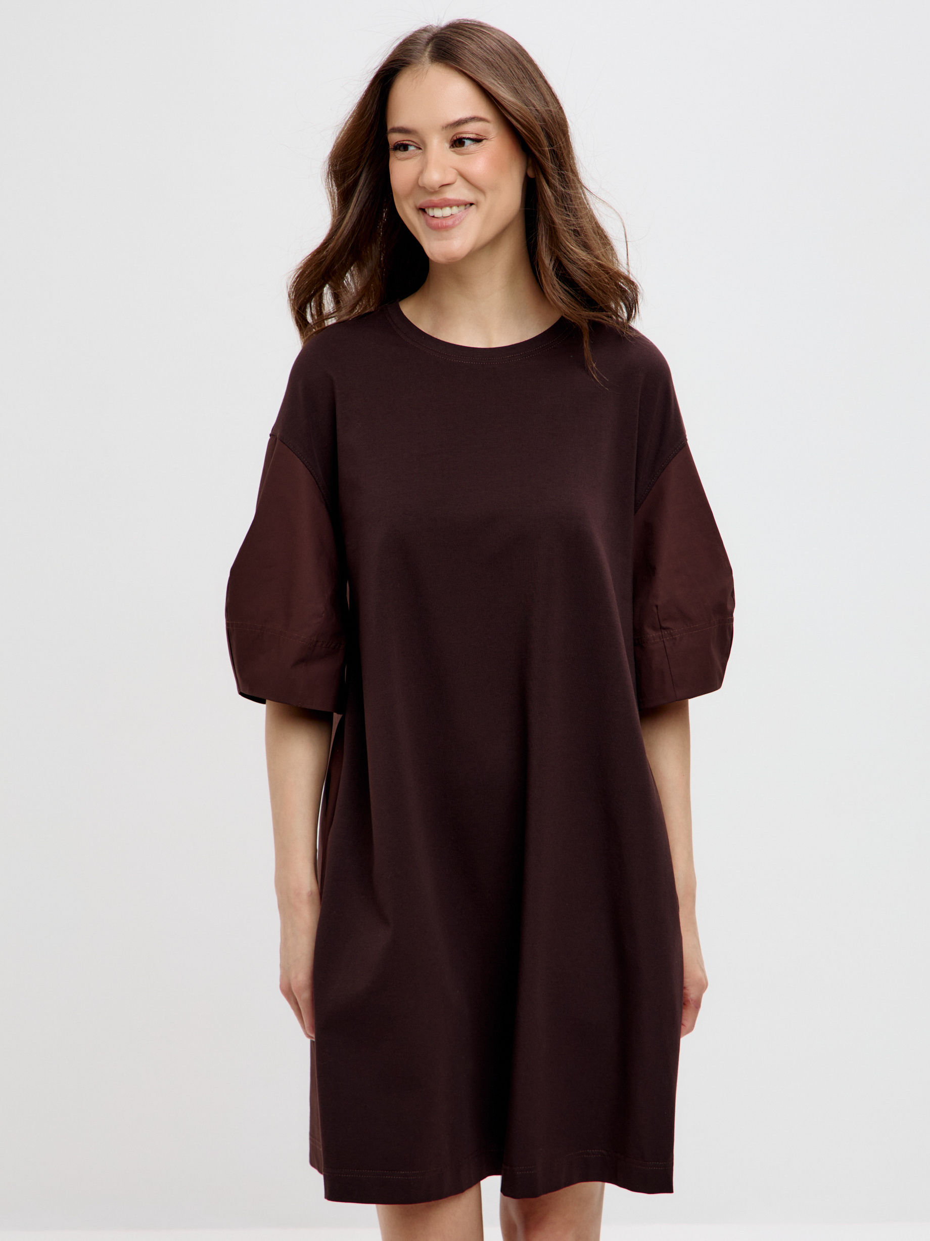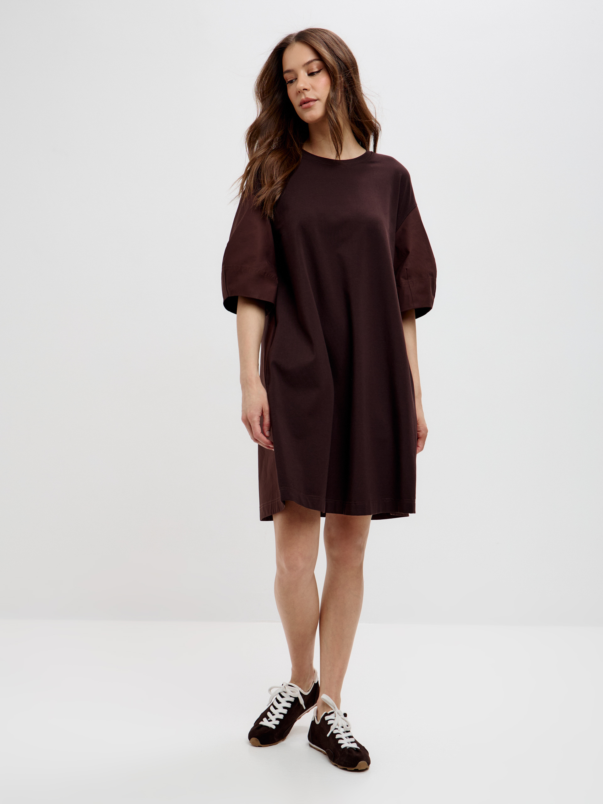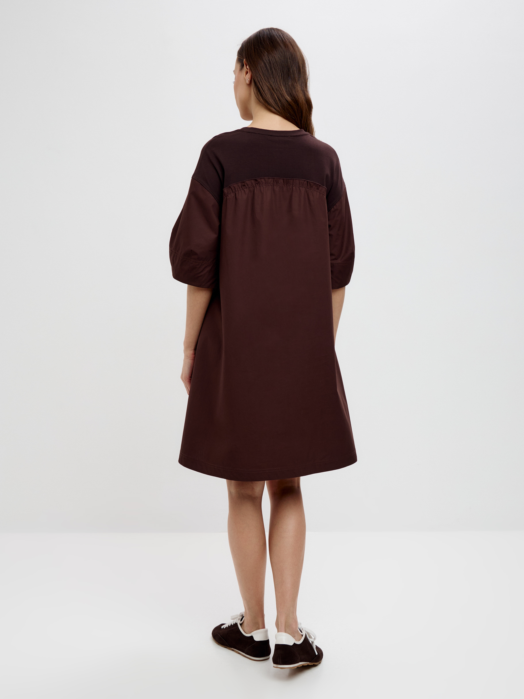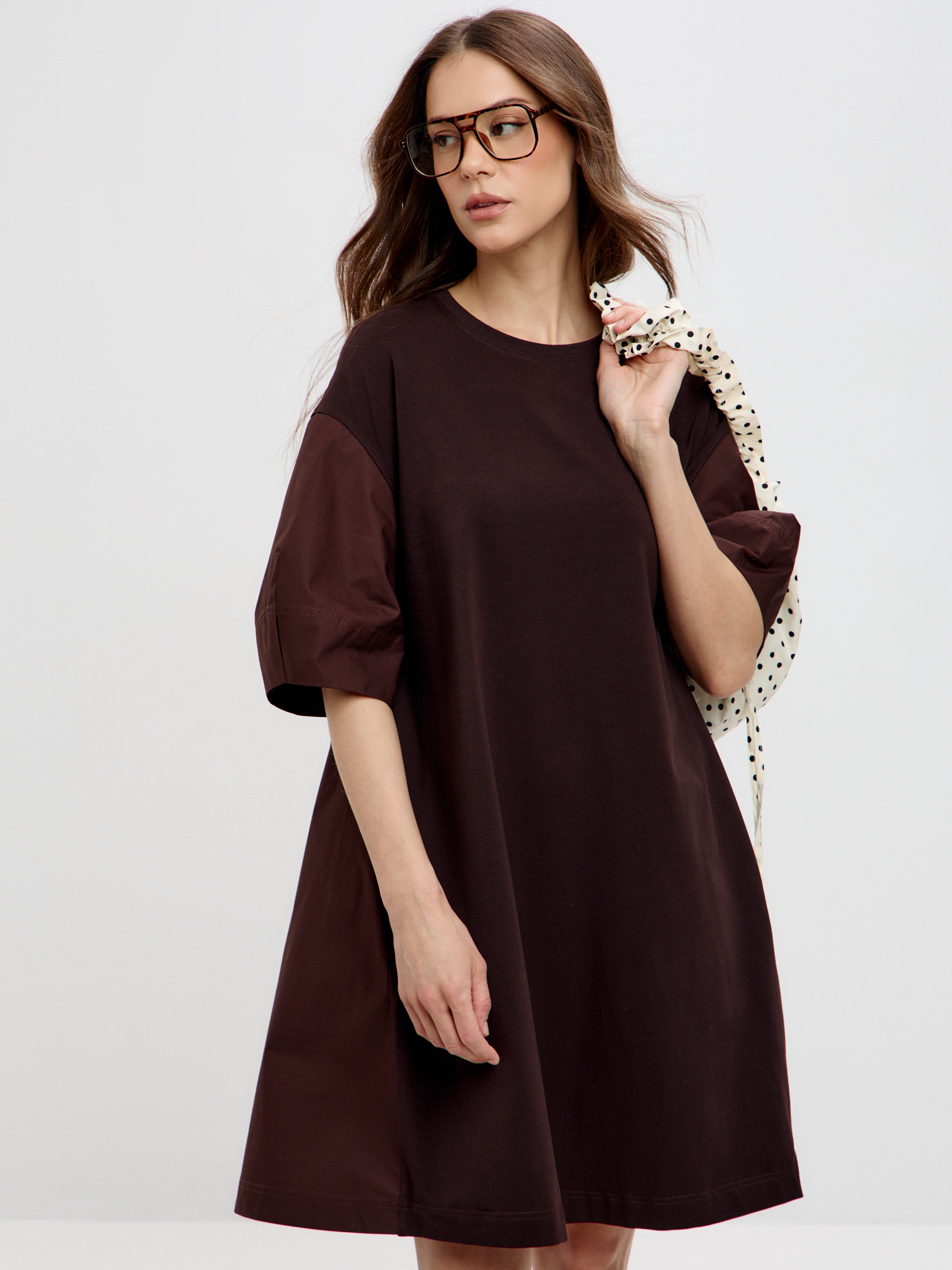 Объемное платье baby doll из комбинации хлопкового поплина (рукава и спинка) и трикотажного полотна.