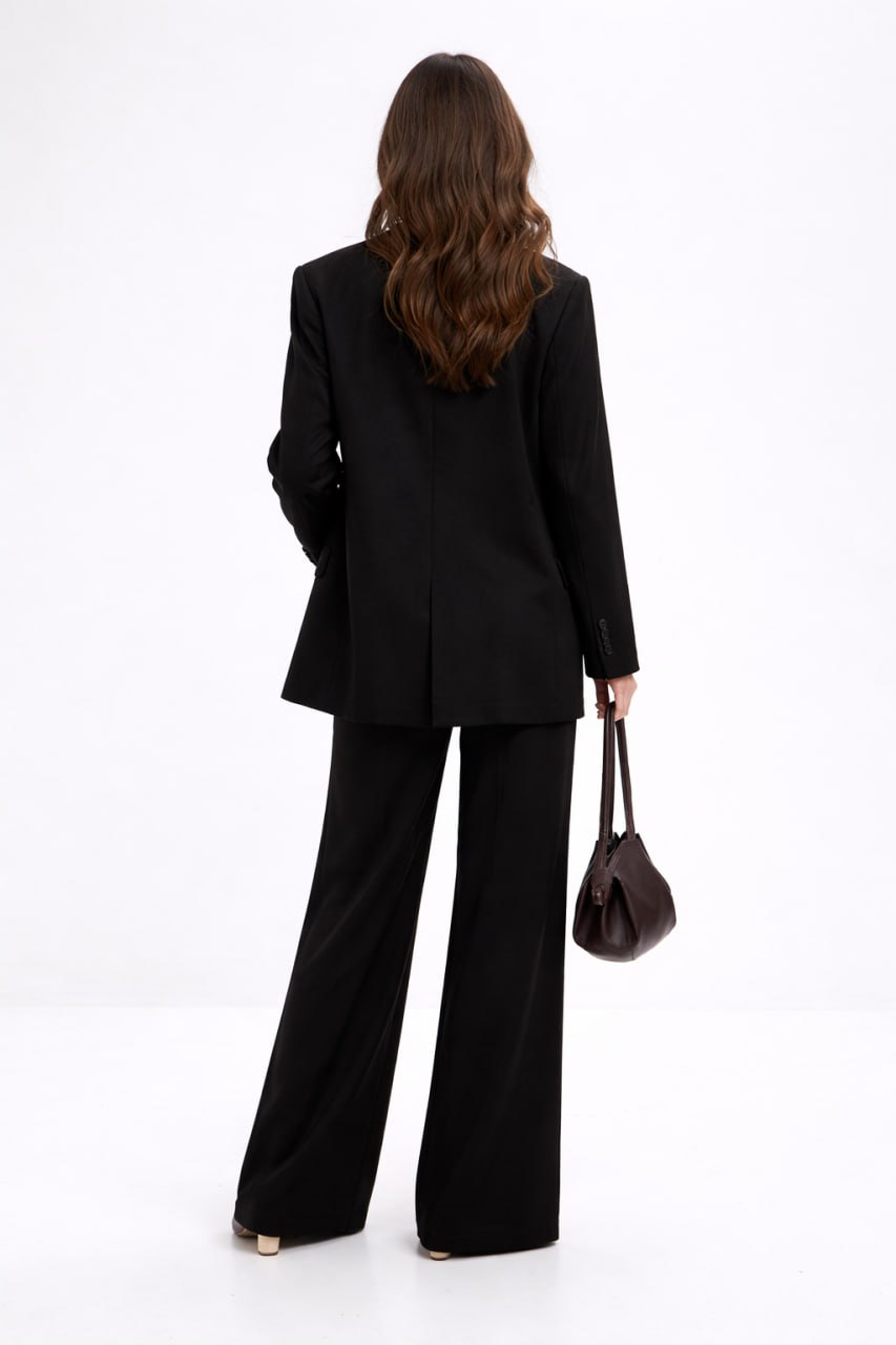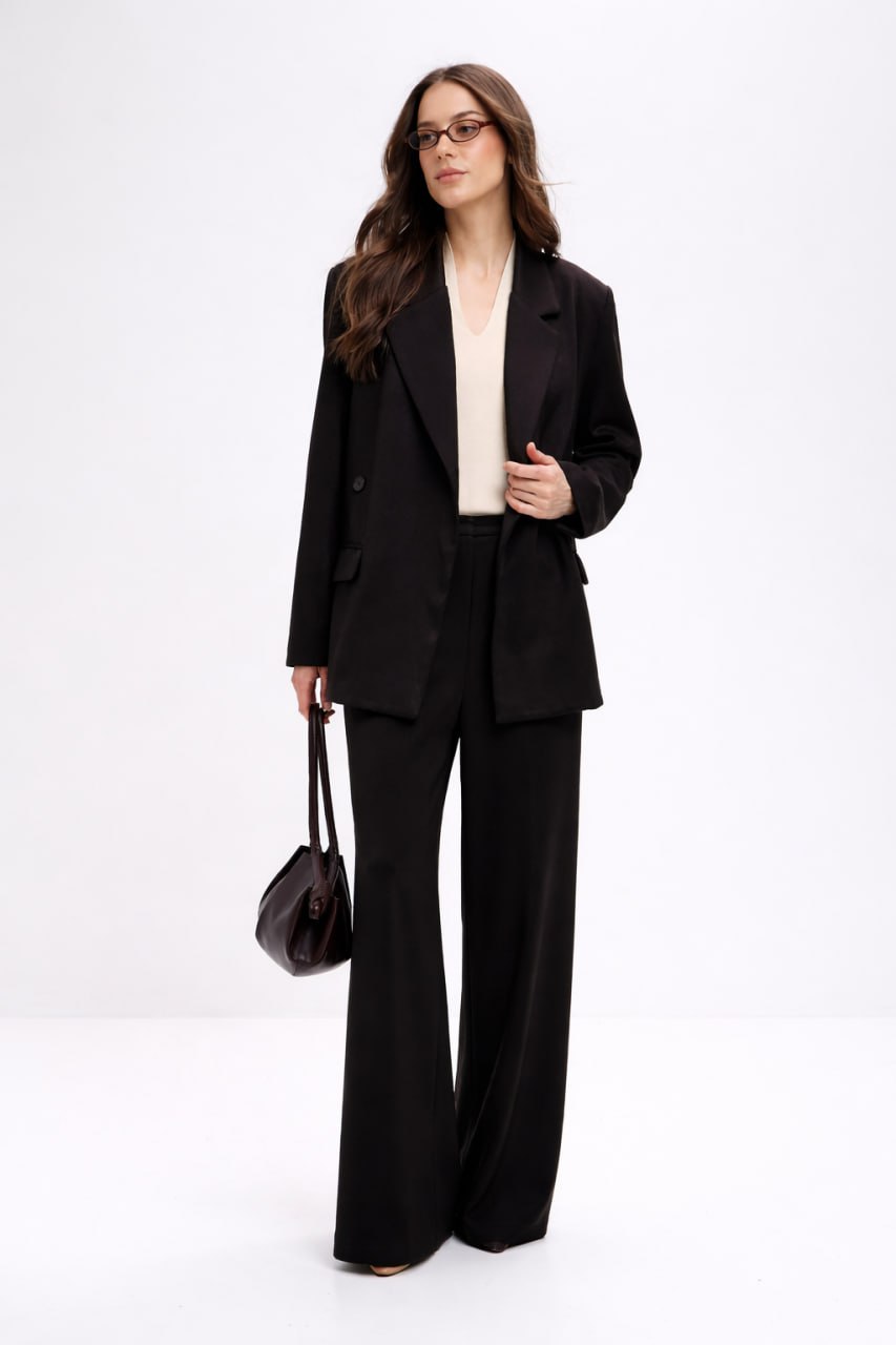 Костюм из мягкого трикотажа, с прямыми брюками на резинке и жакетом свободного силуэта.