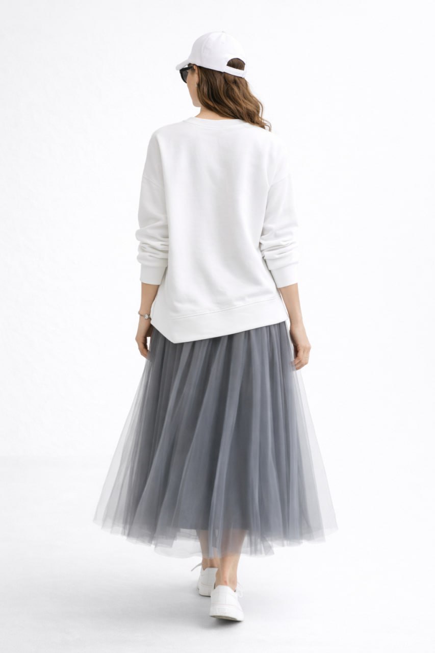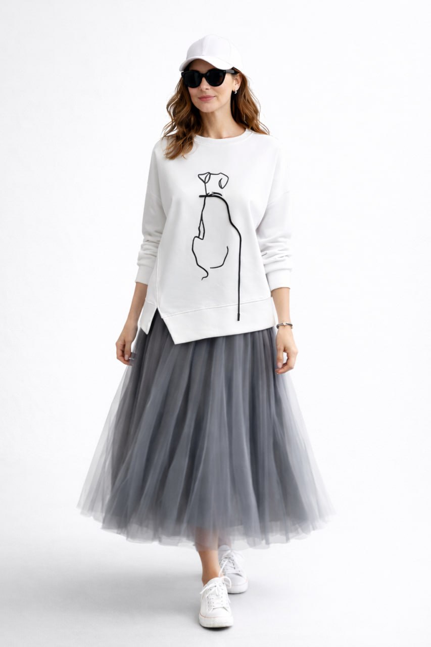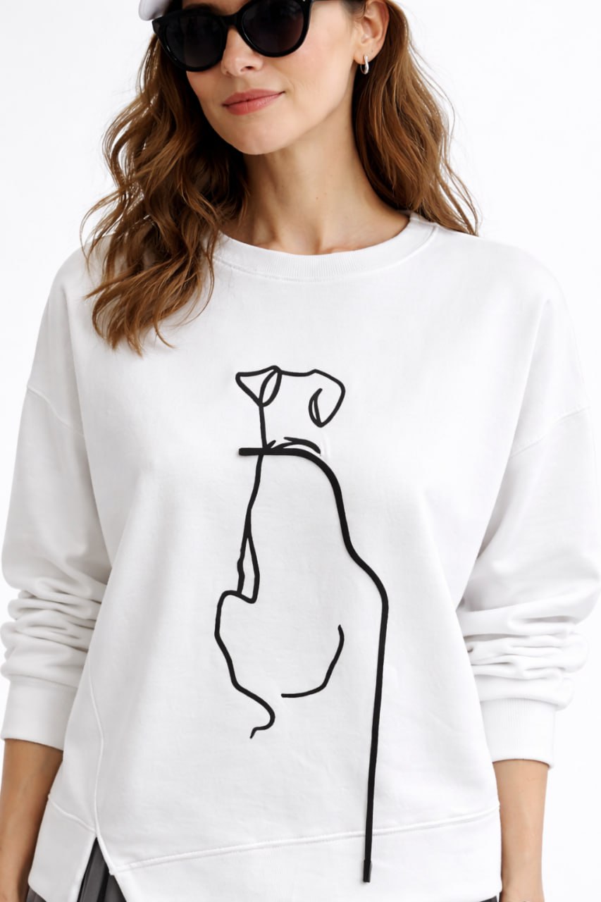 Свитшот из хлопка прямого силуэта с круглым вырезом, объемными рукавами и акцентным рисунком.