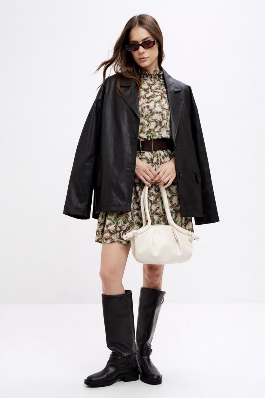 Жакет из экокожи свободного силуэта, с разрезами и декоративными карманами по бокам.